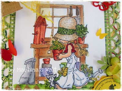 I have masked two stamps together: Mom Mannings "Potter's Bench" and a Sarah Kay stamp "Olivia and her kittens"...ehm....you will only see one kitten on my card ;)