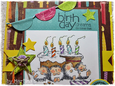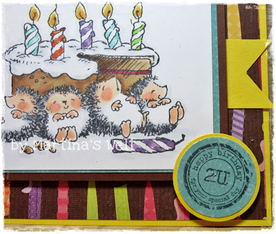 This time I have used one of my older rubberstamps, still mounted on wood, which I really love but have not used for ages. It is a Penny Black one and called "Party Pooped". I was feeling very similar last Sunday on my Birthday...;) LOL